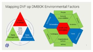 In de plaatjes hierboven komen de kleuren uit het DVF (links) overeen met respectievelijk de knowledge areas en environmental factors uit het DMBOK framework (rechts). Deze visuele presentatie geeft aan hoe je beide frameworks met elkaar kunt combineren. Door deze combinatie kan je de waarom- en de hoe-vraag aan elkaar verbinden en succesvol de transformatie maken naar een organisatie die effectief én efficiënt data gebruikt als bedrijfsmiddel!